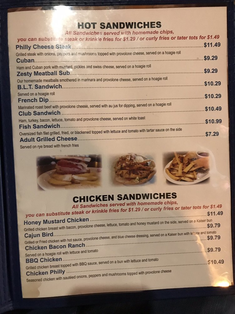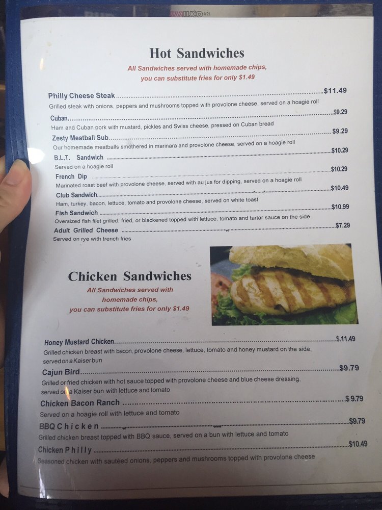 Grilled steak with onions, peppers and mushrooms topped with provolone cheese, served on a hoagie roll. All sandwiches are served with homemade chips and a pickle spear.